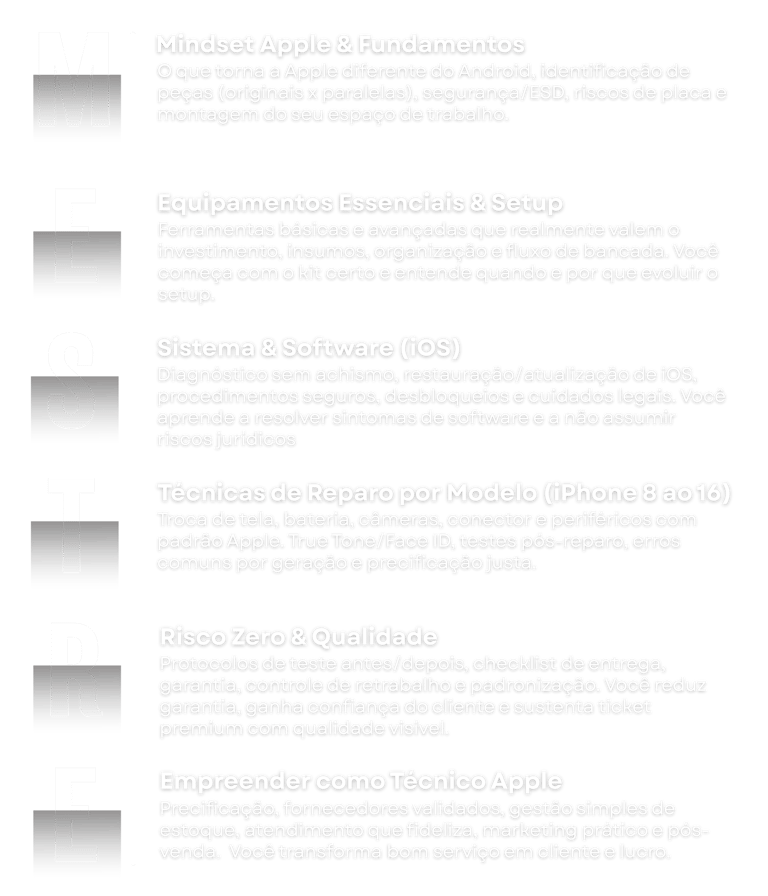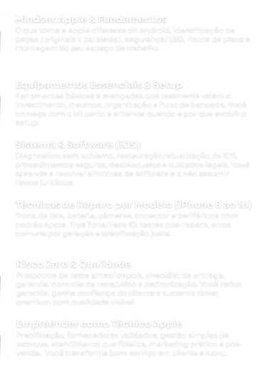 Hoje, minha missão é simples: ensinar de forma clara, prática e atualizada tudo o que aprendi em anos de mercado, para que você também se torne um especialista em iPhone, preparados para atuar com segurança, qualidade e reconhecimento em um dos mercados mais lucrativos da tecnologia.